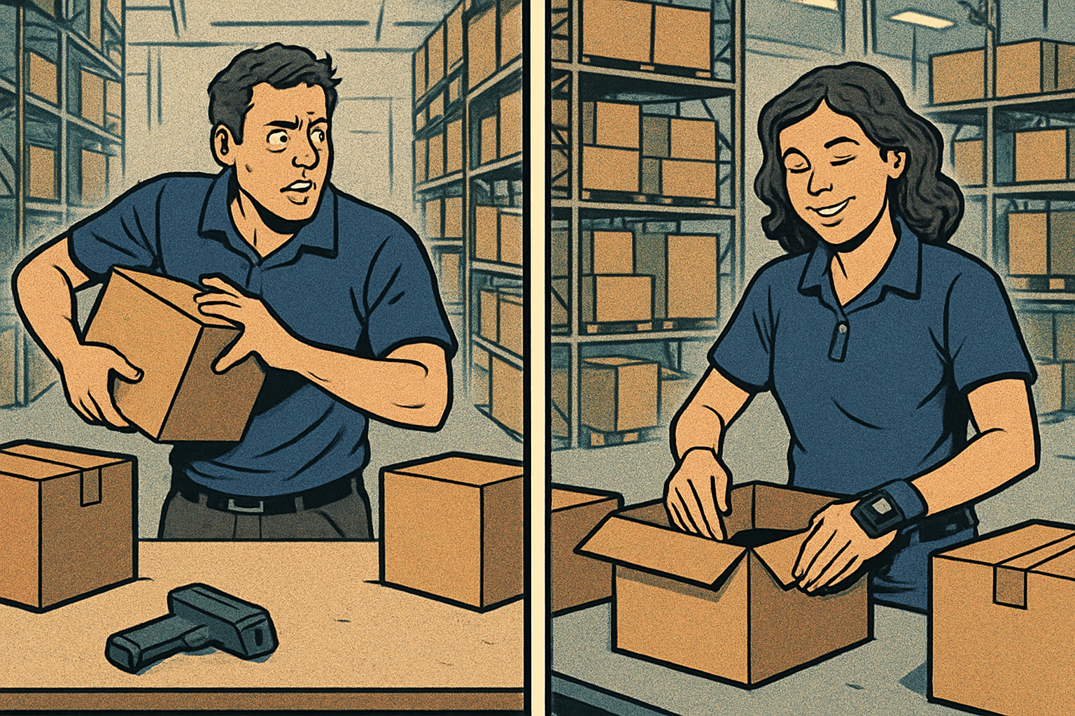 Een orderpicker staat voor een pallet met dozen. Op het scherm: 156 stuks verzamelen. Even denken... dat zijn dus 5 outers van 30 stuks plus nog 6 losse. Of nee, wacht, waren het nou 6 stuks per inner? Dan ...